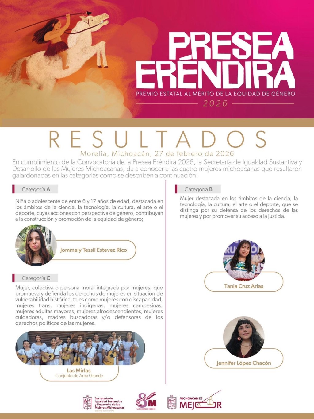 La Secretaría de Igualdad Sustantiva y Desarrollo de las Mujeres Michoacanas (Seimujer) dio a conocer a las ganadoras de la Presea Eréndira 2026, reconocimiento estatal al mérito de la equidad de género que distingue a niñas, adolescentes, mujeres y colectivas cuyas acciones contribuyen a la transformación social y a la defensa de los derechos humanos de las mujeres en el estado.