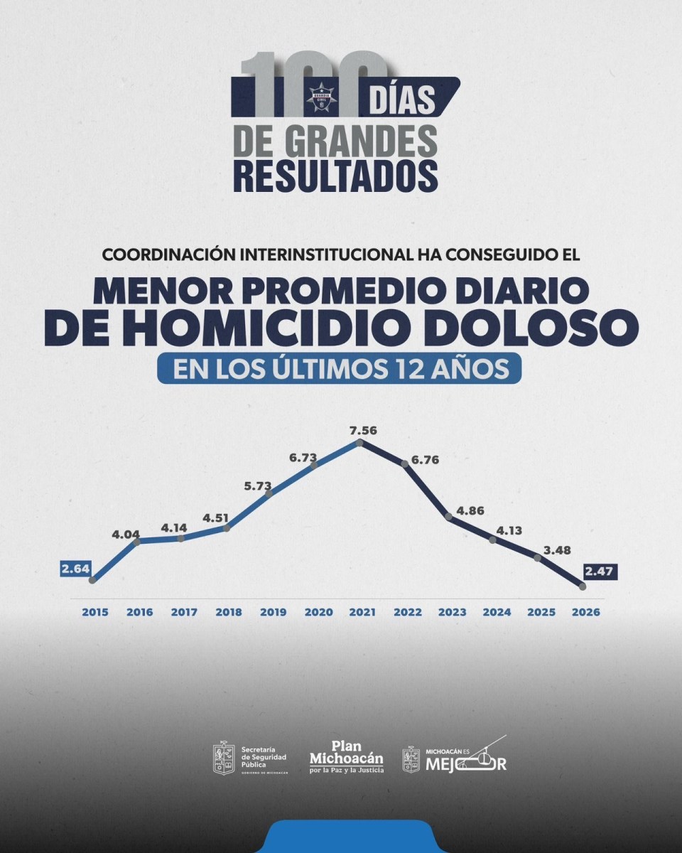 El secretario José Antonio Cruz Medina destacó que estos resultados forman parte de una estrategia basada en inteligencia, investigación y despliegue operativo, la cual ha permitido mantener la tendencia a la baja en los homicidios dolosos en Michoacán, registrando actualmente el promedio diario más bajo de víctimas en los últimos 12 años, con 2.47 casos por día, de acuerdo con las estadísticas presentadas.
