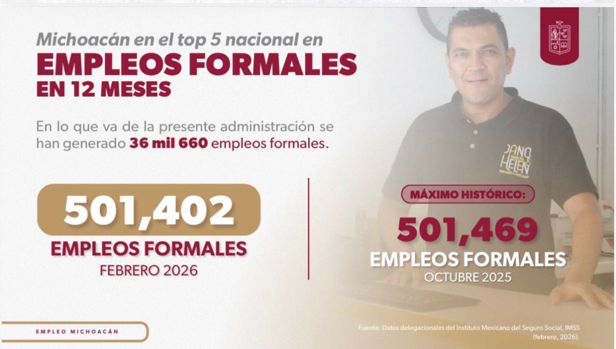 Resultado de las políticas de fomento económico y la confianza del sector empresarial, Michoacán se ha consolidado como una de las cuatro entidades con mayor dinamismo laboral en el país. Al cierre del último reporte de febrero pasado, el estado alcanzó un registro de 501 mil 402 trabajadores asegurados ante el Instituto Mexicano del Seguro Social, reafirmando su posición de liderazgo en la creación de empleo formal, así lo señaló el gobernador Alfredo Ramírez Bedolla.