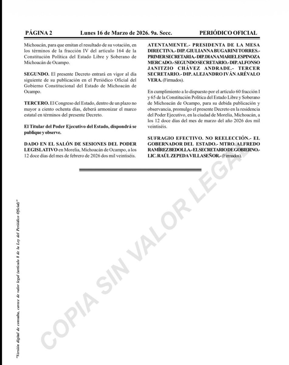 El encargado de la política interna explicó que el decreto establece además que la reforma entrará en vigor al día siguiente de su publicación, y que el Congreso del Estado deberá armonizar el marco jurídico estatal en un plazo no mayor a 180 días.