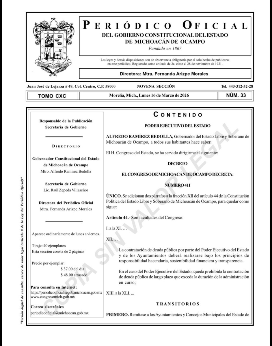 De acuerdo con la edición correspondiente a este lunes 16 de marzo de 2026, la publicación del Decreto número 411 formaliza la adición constitucional que establece que el Ejecutivo no podrá contratar deuda que exceda la duración de la administración en turno, bajo los principios de responsabilidad hacendaria, sostenibilidad financiera y transparencia.
