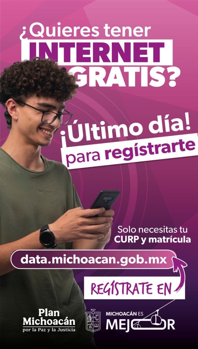 La secretaria de Educación, Gabriela Molina, informa que este viernes es el último día para que estudiantes de nivel medio superior y superior realicen su registro al Programa D4TA Datos Gratis. Esta iniciativa, impulsada por el gobernador Alfredo Ramírez Bedolla, busca abatir la brecha digital y garantizar que la juventud cuente con herramientas tecnológicas para su formación académica, en sintonía con las políticas de bienestar que encabeza la presidenta Claudia Sheinbaum Pardo.