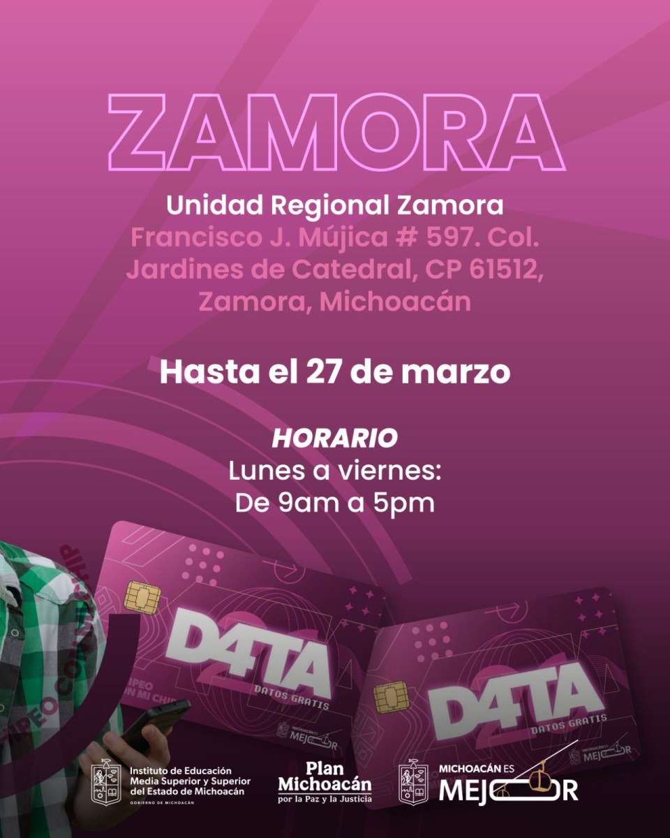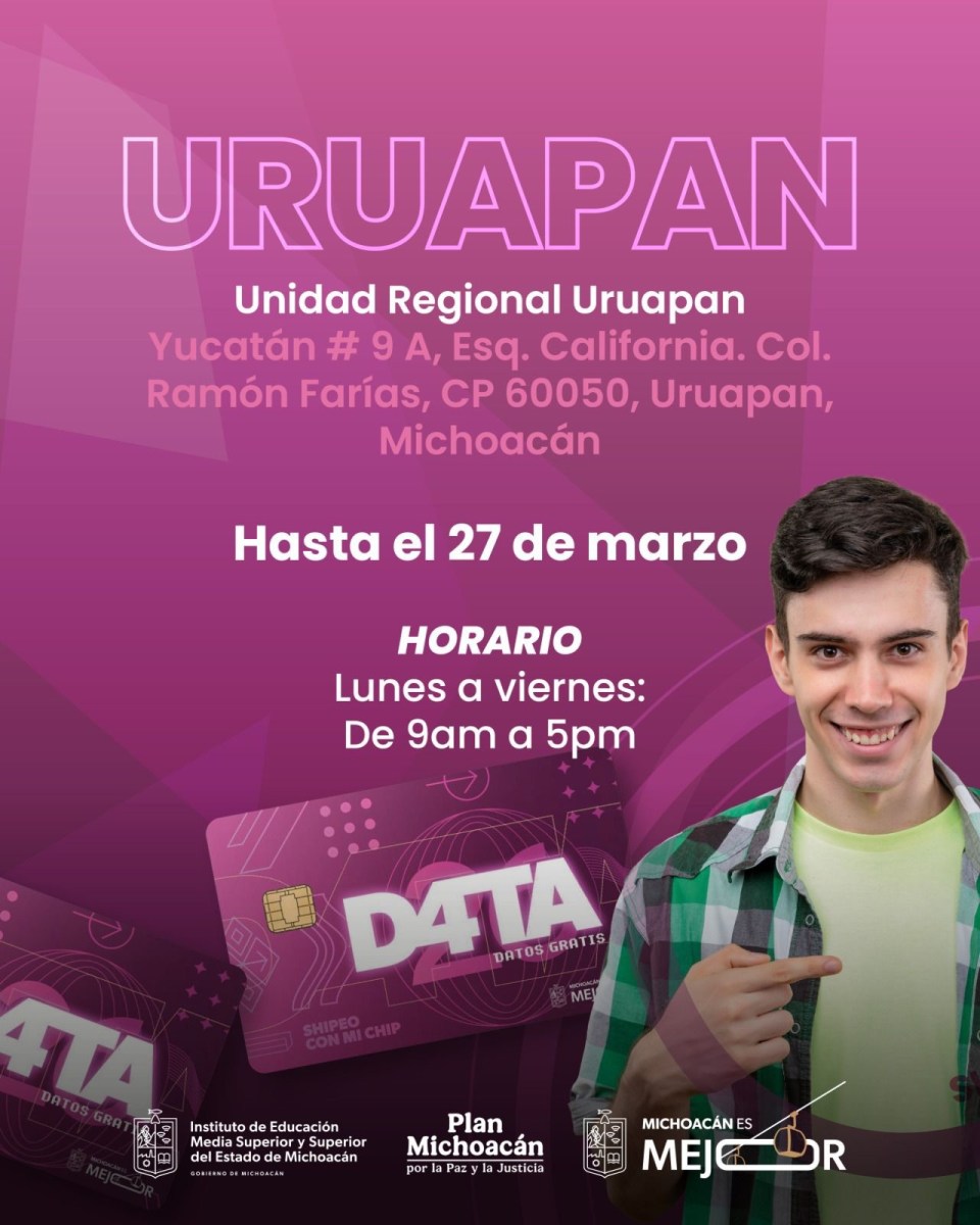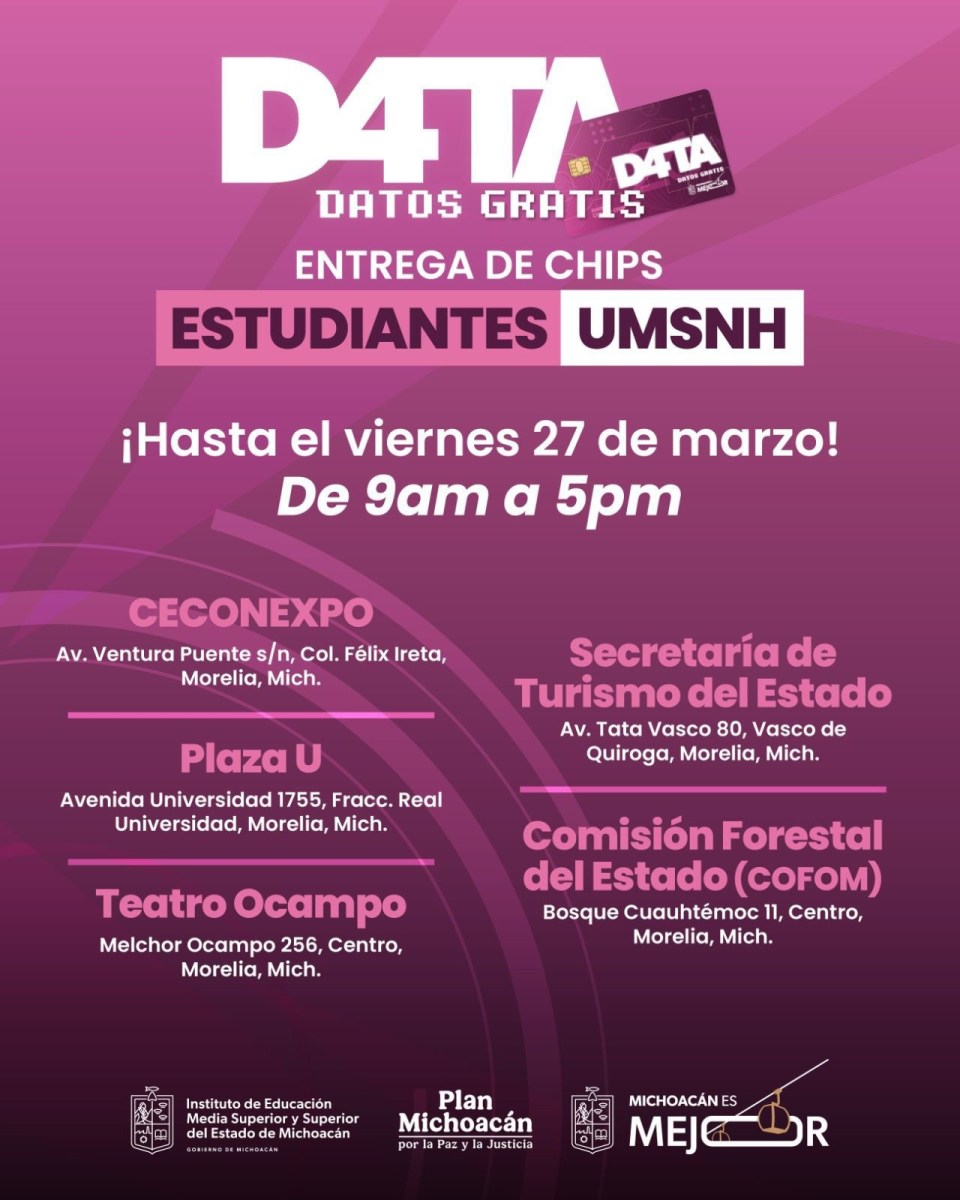 Para acercar los beneficios del Programa D4TA Datos Gratis a todas las regiones del estado, el Instituto de Educación Media Superior y Superior del Estado (Iemsysem) invita a estudiantes de la Universidad Michoacana de San Nicolás de Hidalgo (UMSNH) a conocer y acudir a las sedes habilitadas en el interior del estado para recoger y activar su chip con internet gratuito.