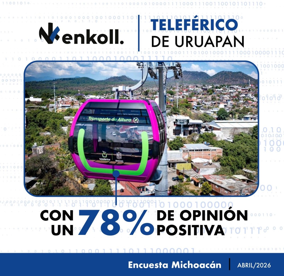 El 78 por ciento de los uruapenses que fueron consultados por la empresa Enkoll, externaron una opinión positiva sobre el teleférico, medio de transporte seguro, ecológico e inclusivo que entrará en funcionamiento el próximo 18 de abril con su inauguración a cargo del gobernador Alfredo Ramírez Bedolla.