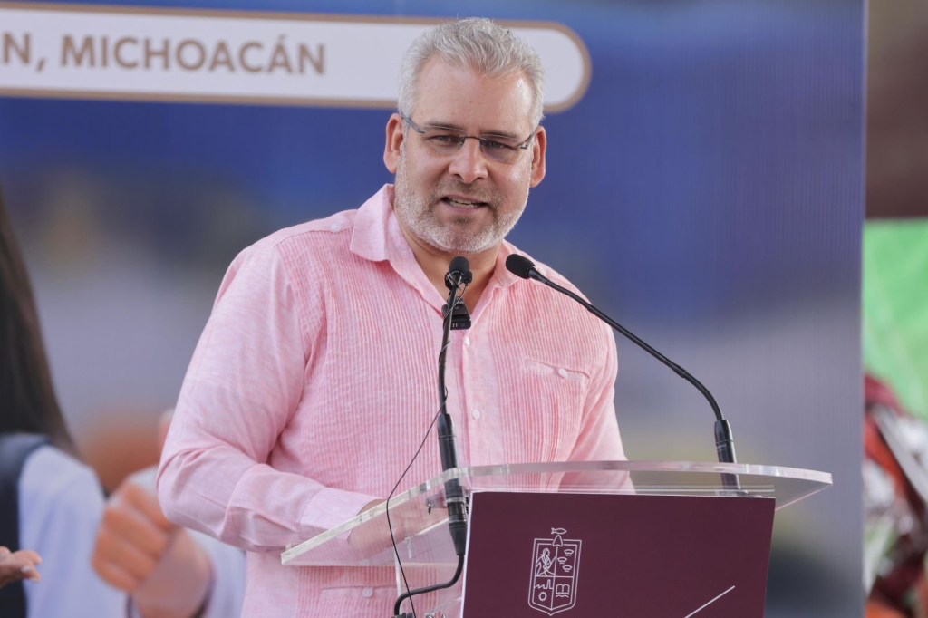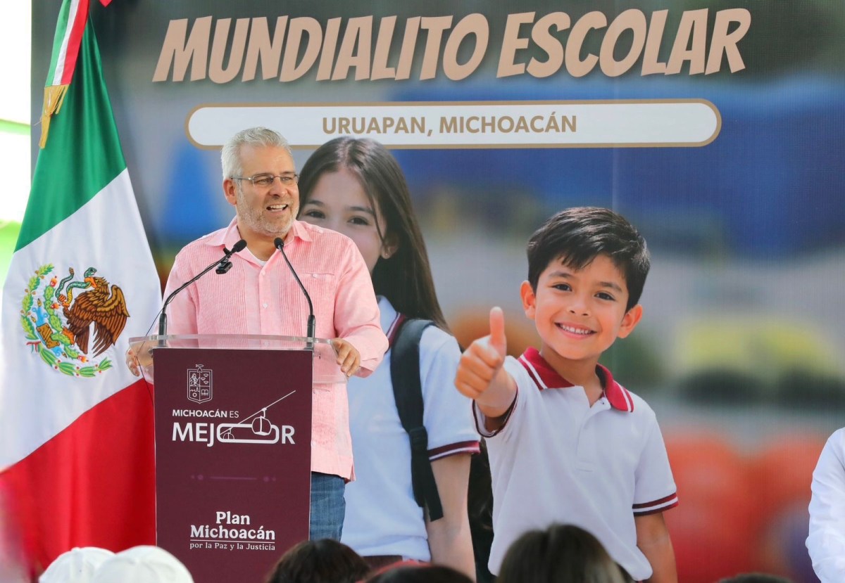 El gobernador Alfredo Ramírez Bedolla arrancó en el municipio de Uruapan, la entrega de material deportivo rumbo al Mundialito Escolar 2026, en beneficio de más de 234 mil estudiantes de mil 405 escuelas de Michoacán.